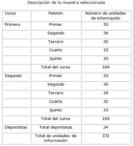 Los datos para este estudio se recogieron a través de una página web diseñada por los investigadores para la auto-administración del instrumento de medición, que se llamó MACROMIL, durante el periodo lectivo de febrero a agosto 2016. Se tomaron cinco pelotones de cada curso, así como a los deportistas, todos aspirantes activos de la ESFORSE.