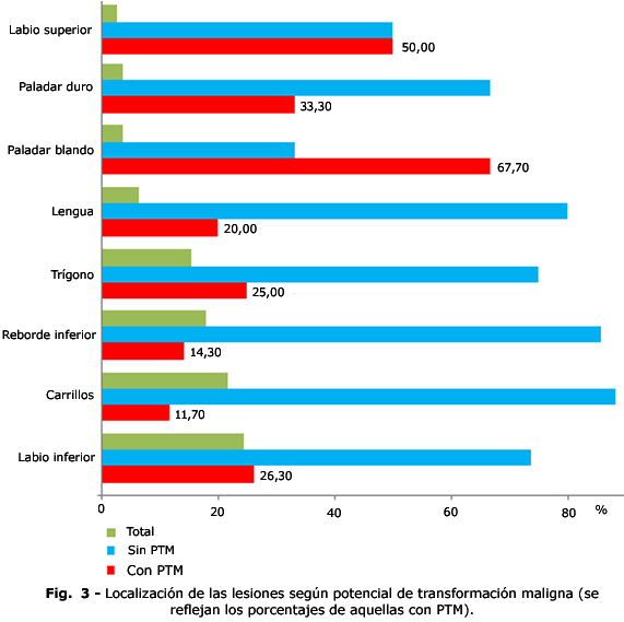 En cuanto a las lesiones con PTM encontradas en este estudio, fue la leucoplasia la más frecuente, lo cual se informa por otros autores(6,13)