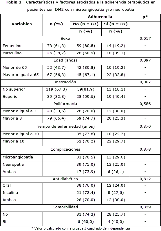 En el análisis bivariado, se observó una mayor frecuencia de adherencia terapéutica en pacientes varones, respecto a las mujeres (39,1 % vs. 19,2 %; p=0,017). Además, hubo una mayor proporción de adherencia terapéutica en pacientes con nivel de instrucción superior, comparados con quienes no tenían nivel superior (40,4 % vs. 18,1 %, p = 0,007).