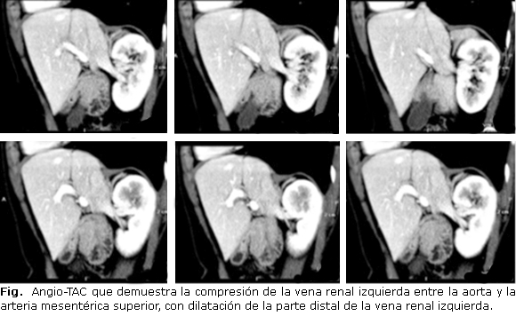 Radiografía de tórax, normal. Ultrasonido renal, normal, doppler renal, normal. Se realizó angio-TAC (angiotomografía computadorizada; fase simple, arterial, venosa y excretora) y se evidenciaron ambos riñones de ecoestructura y tamaño normal. Arterias únicas y normales. Venas renales únicas con ligera compresión de la vena renal izquierda, por disminución del ángulo aorto mesentérico (ángulo 25°). Es decir, la vena se encontraba comprimida por la arteria mesentérica superior, que ocasiona ligera dilatación pre-compresiva, compatible con síndrome renal del cascanueces anterior.
