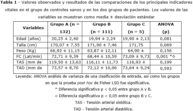 Los valores correspondientes a edad, talla, peso, FC basal y tensiones arteriales sistólica y diastólica de cada grupo, medidas antes de comenzar los registros, se muestran en la tabla 1. La comparación de estos indicadores entre los grupos, utilizando la prueba ANOVA, solo mostró diferencias significativas para la FC basal (p = 0,001). Esta fue significativamente menor en los pacientes del grupo B con respecto al grupo control (p < 0,05), así como que los valores observados para el grupo C de pacientes, fueron significativamente mayores que los del grupo B de pacientes (p < 0,05).