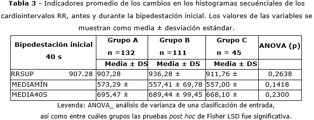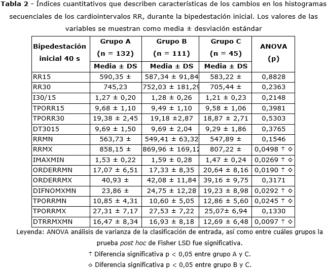 En la tabla 2 se muestran los resultados de indicadores cuantitativos de las respuestas, calculados a partir de los histogramas secuenciales de cardiointervalos RR de cada sujeto, durante la fase inicial de la bipedestación.