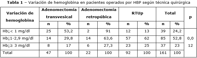 La tabla 1 destaca que el sangrado, considerado por la disminución del nivel de Hb durante la intervención quirúrgica, difiere significativamente entre las técnicas operatorias (p = 0,012). La adenomectomía transvesical es la técnica que afectó menos la Hb. La adenomectomía retropúbica prostática mostró mayor afectación de la Hb, fue la técnica que tuvo el mayor por ciento de pacientes con caída de la Hb igual o superior a 3 mg/dl. La resección transuretral prostática fue similar a la anterior, aunque la disminución de la Hb fue ligeramente menor.