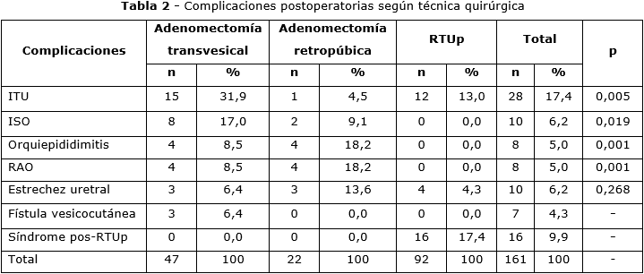 La adenomectomía retropúbica, fue la técnica quirúrgica con mayor número de complicaciones y la de menor número, la RTUp. La retención aguda de orina por la técnica retropúbica fue la complicación más frecuente. El mayor porcentaje de pacientes que tuvo disminución de la Hb en el posoperatorio, fueron los intervenidos con la técnica retropúbica. El tiempo de sondaje vesical más prolongado fue con la técnica retropúbica y el más corto, en los operados con RTUp. La estancia hospitalaria más larga fue en los operados con la técnica retropúbica y la más breve, con la RTUp.