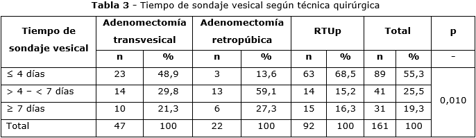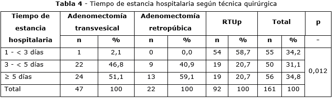 El tiempo de estancia hospitalaria según la técnica quirúrgica utilizada, se muestra en la tabla 4. Se destaca en la técnica transvesical, que en el 46,8 % de los pacientes fue de 3 a < 5 días, en la retropúbica, el 59,1 % fue ≥ 5 días y en la RTUp, el 58,7 %.