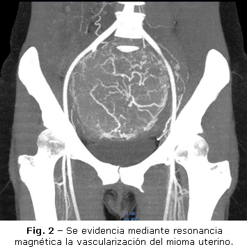 En la discusión con el colectivo médico se decidió preparar a la paciente para realizar embolización selectiva de las arterias uterinas. Previo al procedimiento se realizó resonancia magnética contrastada, en secuencias T1, T2 y técnica de supresión grasa, a fin de determinar la viabilidad del proceder (Fig. 2).