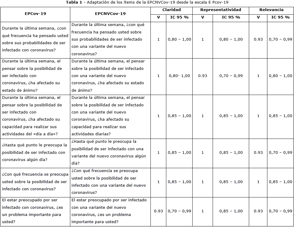 La escala EPCNVCov-19 se adaptó en tiempo y contexto, por lo que la frase "ser infectado con coronavirus" se reemplazó por "ser infectado con una variante del nuevo coronavirus" (tabla 1). Se analizó la evidencia de validez basada en el contenido; los 5 expertos indicaron que los ítems de la escala son claros, representativos y relevantes (coeficiente V de Aiken (V) > 0,70). Los ítems 1, 2, 3, 4 y 5 fueron mejor evaluados en cuanto a claridad (V = 1,00; IC 95 %: 0,80-1,00), la mayoría de los ítems fueron evaluados como importantes (V = 1,00; IC 95 %: 0,85-1,00) y los ítems 2, 3 y 5 los más representativos (V = 1,00; IC 95 %: 0,85-1,00).