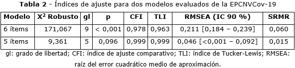 Se analizó la unidimensionalidad de la EPCNVCov-19 a través del análisis factorial confirmatorio (AFC) usando modelos de ecuaciones estructurales (SEM). Se sometió a análisis un modelo de 6 ítems, el cual obtuvo índices de bondad de ajuste adecuados (CFI > 0,95, TLI > 0,95, SRMR < 0,08), excepto en dos índices (p < 0,05, RMSEA > 0,08).