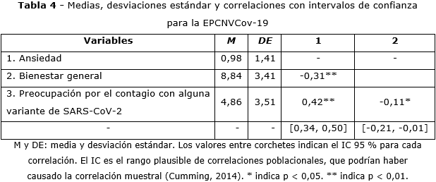 En la tabla 4 se observa que la variable preocupación por el contagio con una variante del SARS-CoV-2 se correlaciona positivamente con la ansiedad (r = 0,42, p < 0,01), sin embargo, se correlaciona negativamente con el bienestar psicológico (r = -0,11, p < 0,05). Aunque esta última es baja, de acuerdo con los intervalos de confianza, no es despreciable. Estos resultados pueden servir para considerar que la escala unidimensional, EPCNVCov-19, presenta evidencia de validez convergente y discriminante.