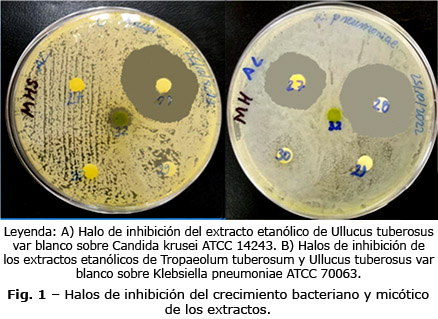 El extracto acuoso de Tropaeolum tuberosum inhibió el crecimiento de Candida albicans y Candida. tropicalis con halos de menor diámetro y diferencia estadística significativa (p< 0,05) respecto del control. El extracto acuoso de Ullucus tuberosus variedades blanco, caramelo y rojo solo inhibieron el crecimiento de C. tropicalis con halos de menor diámetro y diferencia estadística significativa (p< 0,05). Los extractos etanólicos no mostraron poseer actividad, con excepción de Ullucus tuberosus variedad blanco que inhibió el crecimiento de Candida krusei con halo de menor diámetro y una diferencia estadística significativa (p< 0,05) respecto del control (tabla 2, Fig. 1).