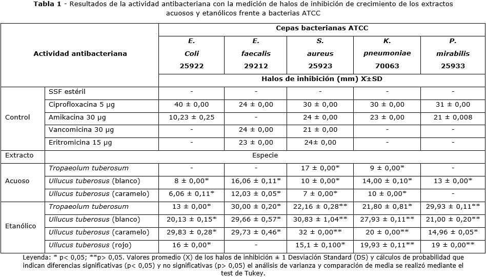 El extracto acuoso de Tropaeolum tuberosum inhibió solo el crecimiento S. aureus y Klebsiella pneumoniae con halos de menor diámetro respecto del control con diferencia estadística significativa (p< 0,05). El extracto etanólico inhibió el crecimiento de todas las bacterias, contra Escherichia coli y Enterococcus faecalis con halos de mayor diámetro respecto del control con diferencia estadística significativa (p< 0,05) y halos similares al control contra Staphylococcus aureus, Klebsiella pneumoniaey Proteus mirabilis con diferencia estadística no significativa (p> 0,05).