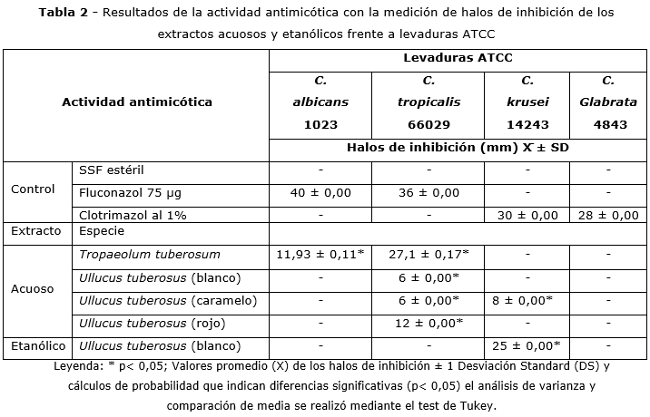 La actividad antimicótica de los extractos acuosos de T. tuberosum y U. tuberosus reveló actividad con diferencia estadística significativa atribuible a una lectina, ya que los extractos etanólicos de ambas especies no mostraron esta actividad, dado que los solventes orgánicos desnaturalizan a las lectinas, excepto en U. tuberosus (blanco) que inhibió el crecimiento de C. krusei, lo que no ocurrió con el extracto acuoso, tal vez por encontrarse en una concentración baja.