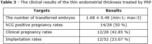 Table 1 presents that endometrial thickness of previous cycles was 5.6 ± 0.79 mm, embryo transferred cycles canceled due to thin endometrium were 3.43 ± 0.63. There were 23 patients with a history of abortion due to stillbirth and 5 patients with unknown causes.