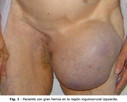 Se trata de una paciente femenina, de 81 años de edad, con antecedentes de salud, que presentaba aumento de volumen inguinocrural, de 27 años de evolución, que ya no le permitía sentarse. Acudió a consulta de cirugía en el Hospital Militar "Dr. Mario Muñoz Monroy". Al examen físico se constató un tumor en la región inguinocrural izquierda, de aproximadamente 35 cm, renitente, indoloro e irreductible (Fig. 1).