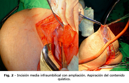 Se administró antibioticoterapia profiláctica (cefazolina 2 g, dosis única). La paciente evolucionó favorablemente. El alta hospitalaria se produjo a los 5 días y el alta médica a los 45 días. La biopsia por parafina confirmó el diagnostico un cistoadenoma. Se mantuvo contacto con la paciente y su evolución fue satisfactoria hasta su deceso, años después por causas naturales.