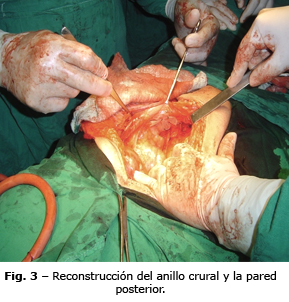 Se operó por incisión media infraumbilical, para abordar por vía posterior (Cheattle Henry). La disección del plano preperitoneal se dificultó por el tamaño del tumor, por lo que se decidió ampliar la incisión para abrir el saco. Se identificó un quiste de ovario y se aspiró su contenido, que fue aproximadamente de 950 mL. Se tuvo la precaución de no derramar líquido en el campo operatorio. El abordaje del saco fue completado por vía anterior, en un procedimiento combinado. Fue abierto el peritoneo, se localizó el pedículo ovárico, el cual se resecó entre ligaduras y fue completada la ooforectomia izquierda. Se envió una muestra a anatomía patológica, para biopsia por congelación, que informó un cistoadenoma. Se cerró el peritoneo con sutura continua. El anillo crural fue reparado con la combinación de elementos de las técnicas de Bendavid y Nyhus, pues se dieron puntos separados de cintilla ileopectínea al ligamento de Cooper y cuando se fijaron, se dejó una malla de polipropileno, de 3 por 5 cm, en forma de paraguas sin mango, que ajustó el anillo crural. La reparación de la pared posterior se realizó por la técnica de Lichtentein, con una malla de polipropileno de 7 por 5 cm (Fig. 2 y Fig. 3).
