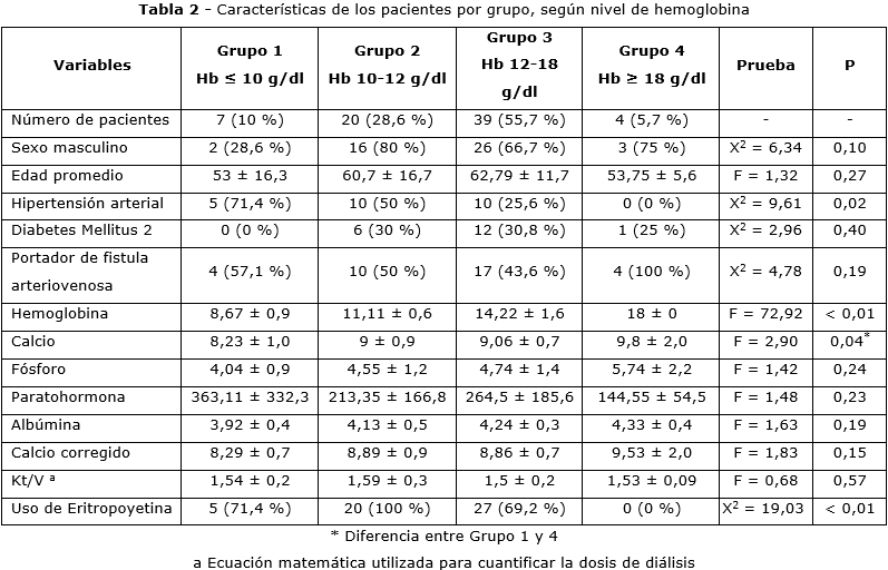 Se evalúo un total de 70 pacientes y se les dividió en cuatro grupos, según nivel de hemoglobina: grupo 1 (< 10 g/dl), grupo 2 (10 - 12 g/dl), grupo 3 (12 - 18 g/dl) y grupo 4 (≥ 18 g/dl).