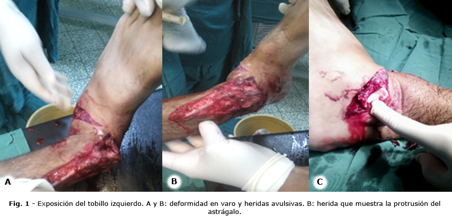 Al examen físico, se observa al paciente consciente y orientado, que responde al interrogatorio con lenguaje claro y coherente; tensión arterial en 95/60 mmHg, palidez cutáneo-mucosa y pulso débil. No tiene lesiones traumáticas en el tórax ni el abdomen. Se visualiza en el miembro inferior izquierdo, marcada deformidad en varo del pie, con respecto al extremo distal de la pierna e inestabilidad articular (Fig. 1 A-B). Presenta herida avulsiva de 10 cm de longitud, extendida desde el tercio distal de la pierna en su cara interna, hasta 2 cm por debajo del maléolo tibial, con exposición ósea de fractura oblicua de la tibia. Además tiene de herida avulsiva transversal a nivel del maléolo peroneo. Se observa el hueso astrágalo (Fig. 1 C).