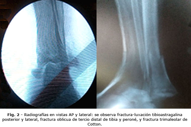 La radiografía del tobillo en su vista ántero-posterior (AP) y lateral, muestran la fractura-luxación posterior y lateral de la articulación tibioastragalina, con fractura oblicua de la tibia y el peroné; además fractura trimaleolar de Cotton en el tobillo (Fig. 2).