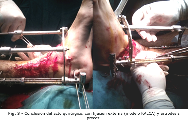 Se realizó intervención quirúrgica de urgencia, con regularización de las heridas, amplio lavado y desbridamiento quirúrgico. Se procedió a la reducción de la fractura-luxación tibioastragalina, con reparación primaria de las lesiones ligamentosas y fijación del maléolo medial con clavo de Rush. Por último, se colocó fijación externa con modelo RALCA, para estabilización definitiva y artrodesis precoz (Fig. 3).
