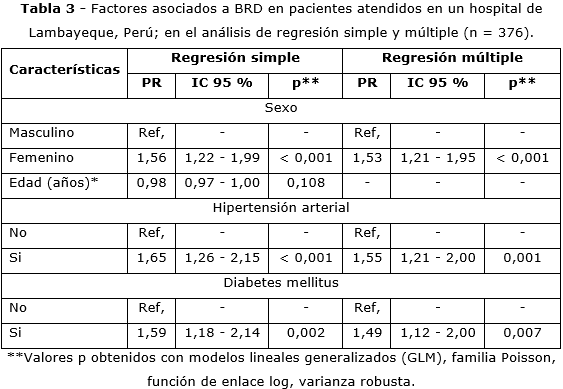 En la regresión simple, la frecuencia de BRD fue 56 % (RP= 1,56), 65 % (RP= 1,65) y 59 % (RP= 1,59) superior en mujeres, hipertensos y diabéticos; respectivamente. Estas diferencias encontradas, se mantuvieron en términos de dirección y magnitud en la regresión múltiple; dado que el sexo femenino (RP= 1,53), antecedente de HTA (RP= 1,55) y diabetes mellitus (RP= 1,49) se asociaron de forma positiva a presentar BRD (tabla 3).