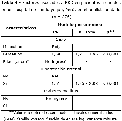 El modelo anidado seleccionó progresivamente las siguientes covariables: sexo y antecedente de HTA. La prevalencia de BRD fue 54 % (RP= 1,54) y 61 % (RP= 1,61) mayor en mujeres e hipertensos (tabla 4).