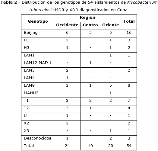 De los aislados MDR en Cuba, se encuentra una asociación entre el linaje Beijing y la resistencia al tratamiento. Se presenta en pacientes activos laboralmente, lo que hace necesario el diagnóstico y tratamiento precoz. La relación de estos casos con los reportados en la base de datos internacional hace imprescindible la vigilancia de la entrada a Cuba de aislados MDR.