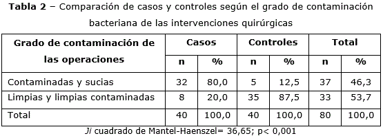 Las intervenciones quirúrgicas contaminadas y sucias se erigieron como factores predictores de complicaciones (OR= 28,0; IC95 %: 8,3 - 94,4), dado que el 80 % de los casos presentaron intervenciones quirúrgicas contaminadas y sucias, en contraposición con los controles, de quienes solo el 12,5 % se contaminaron (tabla 2).