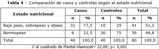 El análisis de la tabla 4 precisa la asociación entre el estado nutricional y la presencia o no de complicaciones quirúrgicas infecciosas. Se evidencia que el bajo peso, el sobrepeso y la obesidad se erigen como factores predictores de complicaciones en los casos (OR= 10,3; IC95 %: 3,6 - 28,9), pues el 77,5 % se complicó, en contraposición con los controles, en quienes se estimó solo el 25,0 % de alteración nutricional.