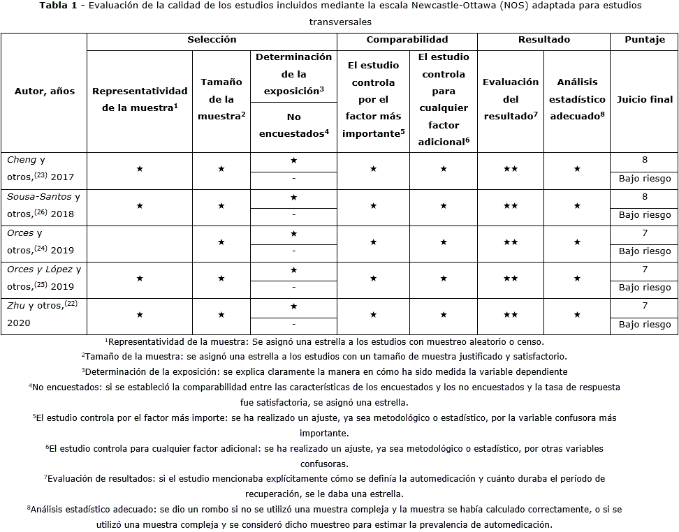 Los 5 estudios seleccionados fueron evaluados con la herramienta NCO para estudios transversales. Ninguno estableció la comparabilidad entre las características de los encuestados y los que no. Todos tuvieron una calidad alta y bajo nivel de sesgo. No se evaluó el sesgo de publicación debido a la poca cantidad de artículos (menos de 10) (tabla 2A y tabla 2B).