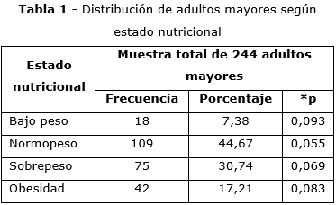 La tabla 1 muestra los resultados del análisis del estado nutricional de los adultos mayores. Destaca que los trastornos por exceso, sobrepeso y obesidad se identifican en alrededor de la mitad de las personas investigadas; existió un mayor porcentaje de personas con sobrepeso.