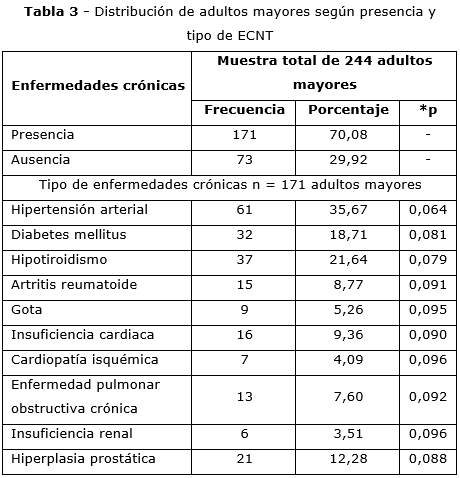 En la tabla 3 se muestran los resultados del análisis de la presencia y tipo de ECNT identificada. Existió un predominio de adultos mayores con al menos una comorbilidad asociada y de ellos, la hipertensión arterial, el hipotiroidismo y la diabetes mellitus fueron las de mayor frecuencia de presentación.