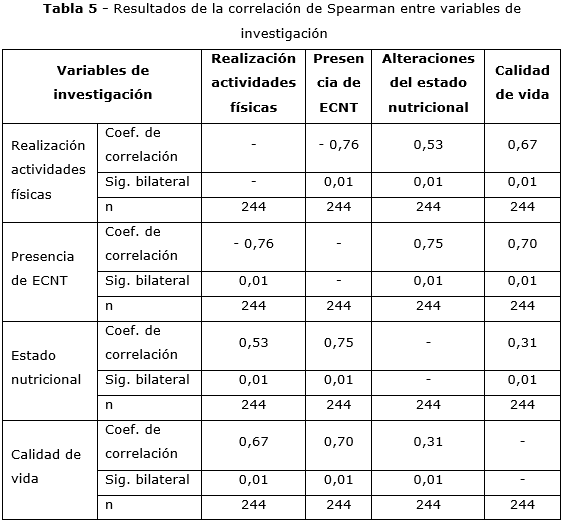 El análisis de la correlación entre variables mostró algún tipo de correlación entre todas las variables. Se identificó correlación negativa fuerte entre actividades físicas y presencia de ECNT y correlaciones positivas fuerte entre presencia de ECNT y alteraciones del estado nutricional. Estos resultados muestran que la realización de actividades físicas disminuye el riesgo de aparición de ECNT y que la presencia de ECNT puede ser un factor para la aparición de alteraciones del estado nutricional y viceversa.