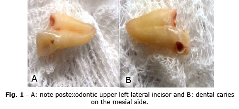 According to the patient's age, biological sex, anatomical position, clinical status of the tooth, available material resources and informed consent, extraction of the permanent upper left lateral incisor was performed and referral to the dental prosthesis specialty for rehabilitation.