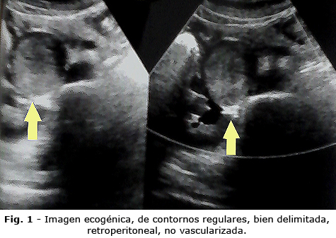 Los exámenes de laboratorio clínico, estaban dentro de límites normales. Se realizó un ultrasonido en el cual se informó (Fig. 1): hígado y vías biliares de aspecto normal, vesícula con litiasis en la proyección del cuerpo, de 7 mm de diámetro; bazo, páncreas y riñones normales, no adenopatías profundas visibles. Se observa imagen nodular, hipoecoica de ecoestructura homogénea, contornos regulares, de 74 x 58 mm de diámetro en proyección del lóbulo caudado del hígado, cabeza de páncreas y marco duodenal, retroperitoneal, separado de las estructuras vecinas. Resto del barrido abdominal negativo. Vejiga vacía.