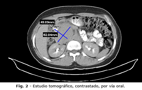 Sobre la base de los resultados anteriores se indicó una tomografía axial computarizada abdominal. Se realizaron vistas simples, y contrastadas con contraste yodado oral (Fig. 2). En el estudio simple se informó la presencia de una imagen nodular epigástrica, con contornos bien delimitados, de 75 unidades Hounsfield (UH). En el estudio contrastado se observó compresión del duodeno, de aspecto regular. Hubo buen paso de contraste al resto del duodeno y a las asas yeyunales, que eran de calibre y aspecto normal; páncreas de tamaño y aspecto normal, sin dilatación de las vías biliares extrahepáticas e intrahepáticas. Los demás órganos del abdomen superior estaban sin alteraciones. El músculo psoas era de tamaño y aspecto normal; el útero también era de aspecto normal.