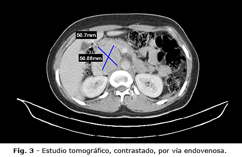 Luego se realizó una segunda exploración, con empleo de contraste intravenoso (Fig. 3). Se informó la presencia de una imagen nodular epigástrica, con ligero realce del contraste, de características heterogéneas, con densidades que oscilan entre 73 a 95 UH, medía aproximadamente 56 mm x 55 mm x 71 mm, de contornos bien delimitados, regulares, que provoca desplazamiento de la vena cava inferior, vena porta, cabeza e inicio del cuerpo de páncreas y cercana a la aorta; contacta con el pilar del diafragma. El resto del estudio del hemiabdomen superior e inferior no tenía datos nuevos.