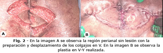 Se realizó el procedimiento quirúrgico como tratamiento definitivo de la lesión, mediante escisión y anoplastia con colgajo en V-Y (Fig. 2), con sutura de los bordes internos de los colgajos al esfínter anal externo, con una sutura sintética multifilamento de absorción lenta, el poliglactin 910, 3-0 USP (United States Pharmacopeia), a puntos separados. Se extirpó la lesión vegetante sobre el borde interno del glúteo derecho, cuya área formó parte del colgajo V-Y.