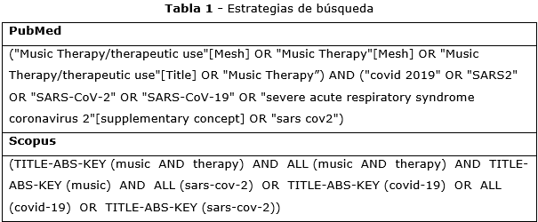 Se realiza una revisión sistemática exploratoria, con base en los pasos descritos por Arksey H y otros(9) y ajustados por Levac y otros.(10) La revisión respondió a la pregunta: ¿Cuál es la utilidad clínica de la musicoterapia en pacientes diagnosticados con infección por SARS-CoV-2?. Se reportamos el artículo de acuerdo con la extensión PRISMA para revisiones sistemáticas exploratorias.(11)