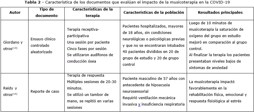 Ensayo clínico: Giordano y otros,(13) aleatorizan y realizan una sesión de musicoterapia a 40 pacientes hospitalizados por la COVID-19, sin requerimiento de tratamiento farmacológico en la UCI ni ventilación mecánica. Se identifica que estos pacientes presentaban trastornos de pánico y ansiedad asociado a su enfermedad. Se evalúa el nivel de ansiedad, frecuencia cardiaca, saturación de oxígeno y el aspecto subjetivo frente al tratamiento. A los 10 minutos del inicio de la terapia, los pacientes presentaban de 2 a 3 puntos porcentuales de saturación de oxígeno. Al finalizar la sesión se evidencia que el 70 % de los individuos no presentaba síntomas de ansiedad, basados en la escala State Trait Anxiety Inventory Y-1 (STAI-Y1). Los autores mencionan que la musicoterpia puede impactar favorablemente en la manifestaciones emocionales y físicas de pacientes con infección por el SARS-CoV-2.