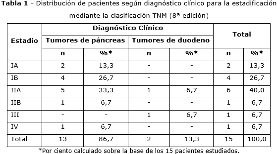La tabla 1 muestra la distribución de pacientes según diagnóstico clínico para la estadificación mediante la clasificación TNM (8ª edición); en 13 enfermos (86,6 %), correspondió a los tumores de páncreas y en los otros 2 a los tumores de duodeno (13,3 %). El estadio IIA, con un total de 6 pacientes para un 40,0 % fue el que prevaleció, seguido por los del estadio IB, con 4 enfermos, para el 26,7 %.