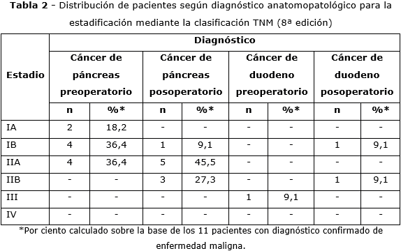 En la tabla 2 se aprecian las variaciones de la clasificación por estadios de los pacientes estudiados; después de practicada la cirugía según los resultados anatomopatológicos. Del total de pacientes, se confirmó la malignidad en 11; de ellos 9 (81,8 %) con cáncer páncreas y 2 (18,2 %) con cáncer de duodeno. El estadio IIA fue el que prevaleció con 5 pacientes, para un 45,5 %, en correspondencia con lo analizado en la tabla anterior. No hubo enfermos con estadificación posoperatoria en etapa IV.