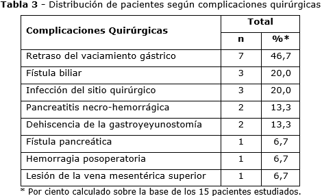 De los 15 pacientes estudiados en la serie, en 12 (80,0 %) aparecieron complicaciones asociadas a la cirugía (tabla 3). Se aprecia que ocurrieron un total de 20 complicaciones, para un promedio de 1,3 por paciente. El retraso del vaciamiento gástrico fue la complicación que prevaleció, con 7 enfermos para un 46,7 %. La fístula pancreática, la lesión de la vena mesentérica superior y la hemorragia posoperatoria se presentaron una sola vez, para un 6,7 % cada una; sin embargo, las 2 últimas provocaron la muerte del paciente en las primeras 48 horas del posoperatorio.