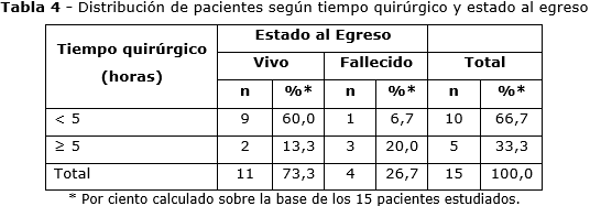 En la tabla 4 se aprecia que 11 pacientes egresaron vivos, para 73,3 % del total, mientras que los 4 restantes fallecieron (26,7 %; IC95 %: 7,7-55,1); de ellos 3 (75 %) fallecieron tras la realización de esta técnica operatoria, cuando el tiempo quirúrgico fue igual o superior a 5 horas. Además, 10 enfermos (66,7 %) tuvieron un tiempo quirúrgico inferior a 5 horas. El rango de este indicador estuvo entre 3,30 y 7,30 horas, con una media y mediana de 4,80 y 4,40 horas, respectivamente.