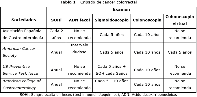 Con el fin de disminuir la incidencia y mortalidad por cáncer colorrectal se han implementado diferentes estrategias o métodos de cribado. Los exámenes realizados deben detectar el cáncer en su etapa temprana (estadio curativo) e identificar y remover las lesiones precancerosas (los adenomas). Tanto las guías europeas como norteamericanas recomiendan iniciar estas pruebas de cribado en pacientes sin factores de riesgo a partir de los 50 años de edad, aunque no existe un consenso claro sobre la técnica preferida de pesquisaje. La selección de uno u otro test depende, en muchos casos, de la calidad del desempeño y también del nivel de recursos del lugar donde se establezca el programa.(21)