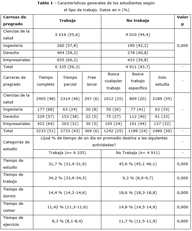 La distribución por grupos de carreras profesionales es la siguiente: Ciencias de la salud (9 026 estudiantes, 80,3 %), ingenierías (450 estudiantes, 4 %), ciencia política (680 estudiantes, 6,1 %) y ciencias de la empresa (1 088 estudiantes, 9,7 %). El 56,3 % de la población estudiantil se encontraba trabajando al momento de la responder la encuesta (6 335 estudiantes). La tabla 1 muestra las características generales de los estudiantes que trabajan vs. los estudiantes que no trabajan. Se detallan también las características del trabajo (para los estudiantes que trabajan), se puede ver que 51 % cuenta con un trabajo a tiempo completo y 43 % con un trabajo a tiempo parcial, solo un 6 % refirió trabajos free lance .