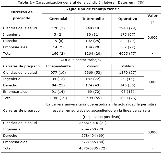 En la tabla 2 se detallan algunos aspectos relacionados con las condiciones laborales de los estudiantes que trabajan. Se puede ver que la mayoría cumple funciones operativas (77 %) y más de la mitad trabaja en el sector privado (55 %) y una cuarta parte en el sector público (26 %). Las diferencias para tipo de trabajo y sector en el que labora fueron significativas según grupo de carreras. El 72 % de la población que trabaja refirió que la carrera profesional que se encontraba estudiando en la universidad le iba a permitir escalar en su trabajo, ascendiendo en la línea de carrera (el mayor porcentaje se vio en los estudiantes de ciencias empresariales e ingenierías, 80 % y 78 % respectivamente).
