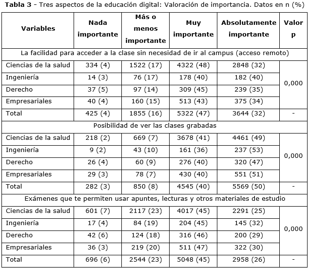 La tabla 3 muestra lo relativo a percepciones en torno a 3 aspectos de la educación digital. El primer aspecto evaluado fue la facilidad para acceder a las clases (debido al acceso remoto); 47 % de los encuestados refirió que era muy importante mientras que 32 % refirieron que era absolutamente importante. Solo el 4 % de la población encuestada refirió que el acceso remoto a clases mediante la educación digital era un aspecto nada importante. Otro aspecto de la educación digital evaluado fue el poder acceder a las grabaciones de las clases; el 40 % juzgó como muy importante y el 50 % como absolutamente importante. Finalmente, se evaluó el aspecto de poder rendir exámenes consultando materiales libremente; el 45 % refirió que era un aspecto muy importante y 26 % un aspecto absolutamente importante.