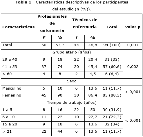 Method: A cross-sectional study was conducted in nursing staff (n= 94;