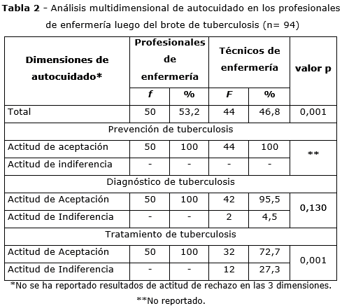 La evaluación multidimensional del autocuidado permitió estimar diferencias entre los profesionales de enfermería y técnicos (p= 0,001). No se determinaron actitudes de rechazo en ninguna de las dimensiones. Todos los participantes presentaron una actitud de aceptación de la prevención de TB, mientras que sobre el diagnóstico de TB 2 (4,5 %) de técnicos de enfermería presentaron una actitud de indiferencia, aunque no se evidenciaron diferencias significativas (p= 0,130). Finalmente, en la dimensión tratamiento de TB, 12 (27,3 %) técnicas de enfermería presentaron una actitud indiferente en comparación con las enfermeras don de todas tuvieron actitudes de aceptación (tabla 2).